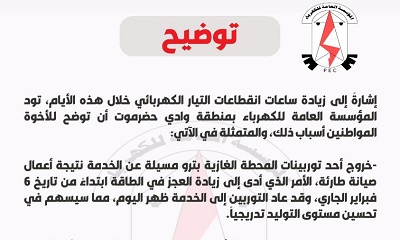 أوضحت المؤسسة العامة للكهرباء – منطقة وادي حضرموت أسباب زيادة ساعات انقطاع التيار الكهربائي خلال الأيام الماضية، مرجعة ذلك إلى جملة من العوامل الفنية والتموينية الخارجة عن الإرادة.